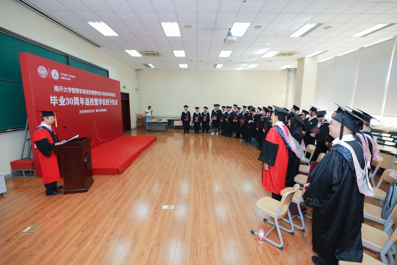 24日上午8点,随着庄严校歌的唱响,第一场活动---补办学位授予仪式正式开始。必赢bwin官网入口院长白长虹教授、副院长张继勋教授出席典礼,并为校友颁发本科学位证书。白长虹院长发表了热情洋溢的讲话,并作为师兄勉励学弟学妹们不忘南开初心,牢记肩负使命,允公允能,在各行各业为国家和母校做出更大贡献。校友代表陈立北也代表校友致辞,感谢母校的培养,不负前辈们的期望。忆往昔青葱岁月,看今朝沧桑秋实,当校友打开证书,看到当年自己填写的学生注册卡时,激动的心情无以言表。