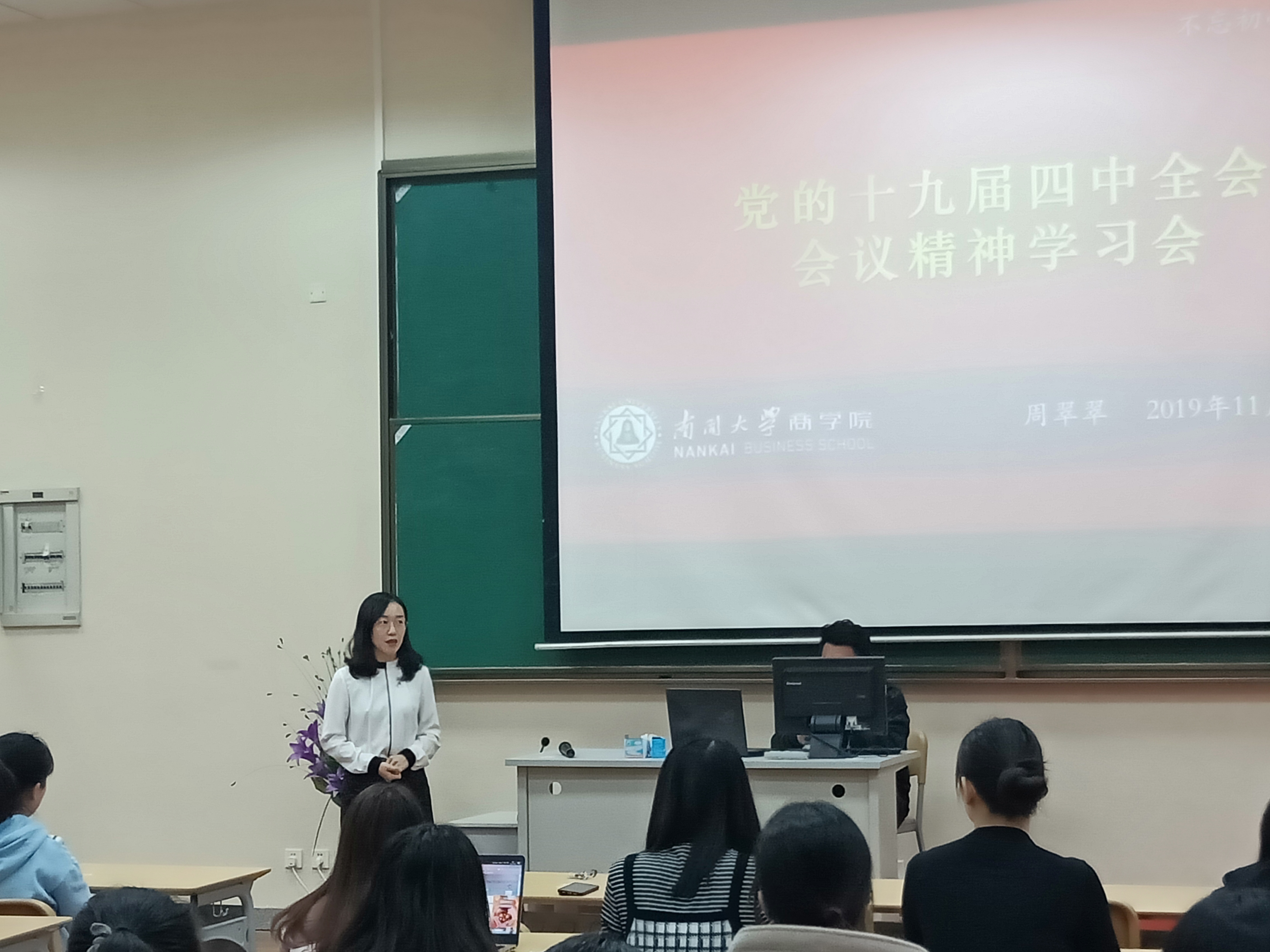 必赢bwin官网入口团委书记周翠翠为支部成员讲授了“党的十九届四中全会”会议精神主题微团课。周翠翠带领支部成员学习了党的十九届四中全会公报,深刻学习了《中共中央关于坚持和完善中国特色社会主义制度、推进国家治理体系和治理能力现代化若干重大问题的决定》中推进国家治理体系和治理能力的总体目标,13个显著优势以及13方面的具体要求。周翠翠指出“党和国家历来重要青年工作,全体青年团员作为党的助手和后备军,要认真学习、领会、贯彻、落实党的十九届四中全会精神,时刻铭记使命担当,不忘初心,砥砺前行!”。