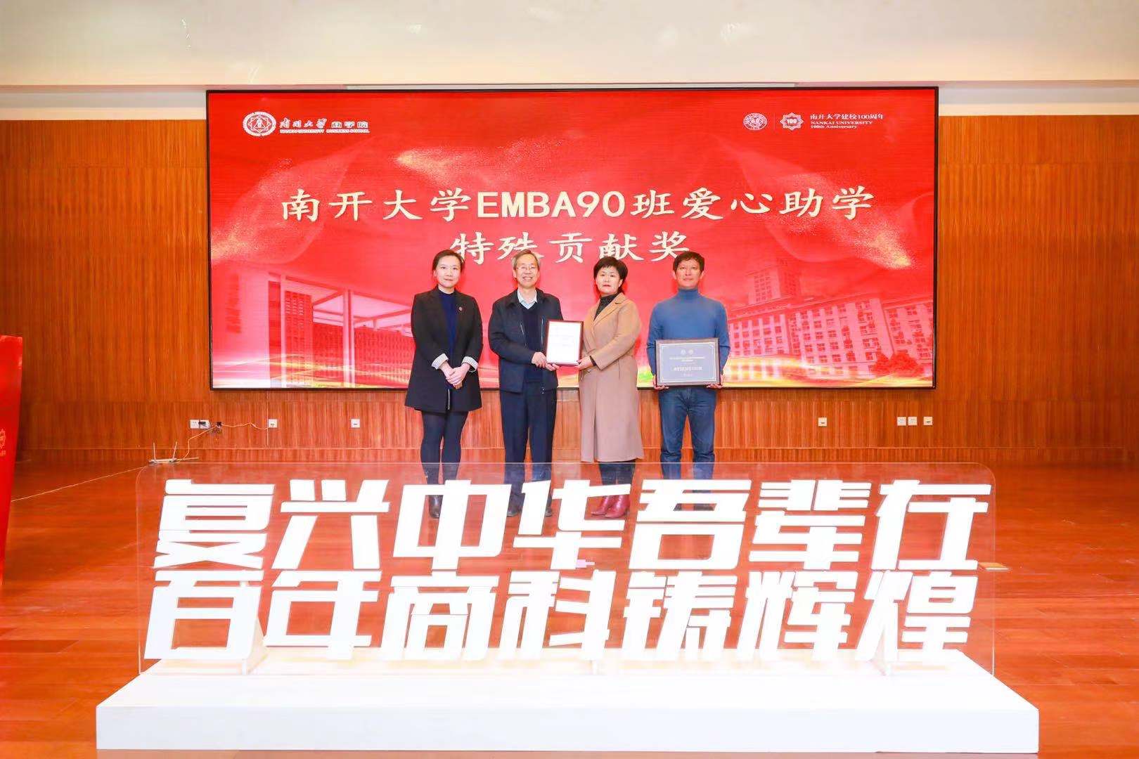 百年南开之际,他们怀着浓浓的南开情,在必赢bwin官网入口教育基金会和必赢bwin官网入口的大力支持下,出资70万元设立“EMBA90班爱心助学慈善信托”,通过未来20年不间断地向必赢bwin官网入口及相关院系学子捐资助学,来感恩南开教育的熏陶和培养,将公能日新的南开精神不断播撒。为感谢校友们的杰出贡献必赢bwin官网入口副院长张继勋和必赢bwin官网入口教育基金会秘书长助理孙怡一同为必赢bwin官网入口EMBA90班颁奖。