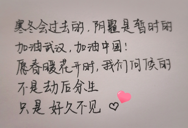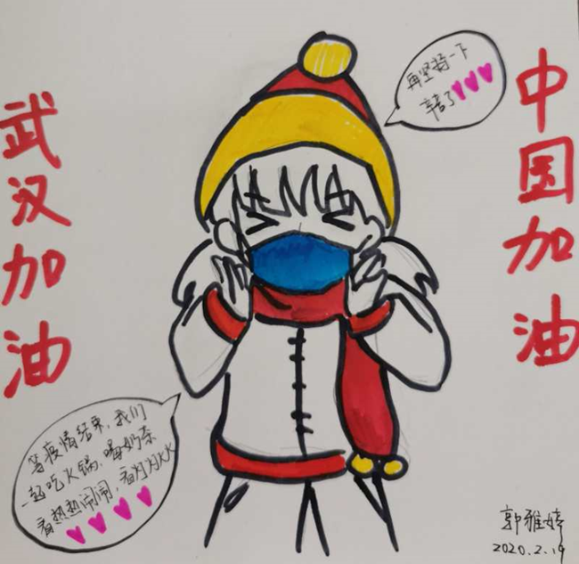 疫情发生,支部同学都持续通过“学习强国”、电视新闻、公众号等官方平台了解国家疫情防控部署和最新进展,为了带动身边群众,增强战胜疫情的信心和决心,必赢bwin官网入口本科生第一党支部的同学通过手写祝福、手绘图画、诗歌创作等方式为武汉加油。同时,支部同学定期开展战“疫”感悟线上分享活动,入党积极分子、2017级本科生佘曾佩写到:“我们身为必赢bwin官网入口之学子,党组织的一员,更应该秉承“允公允能”之校训,做好防护措施,保持清晰的头脑,贡献自己的力量。”