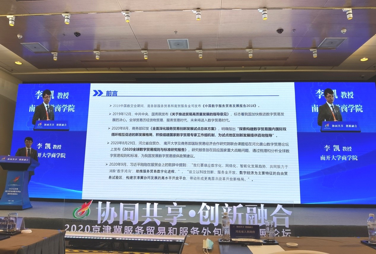 2020年9月5日,必赢官网数字商务研究中心主任李凯教授受主办方邀请,参加在国家会议中心举办的2020中国国际服务贸易交易会,并在2020京津冀服务贸易和服务外包协同发展论坛做题为“全球数字贸易规则分析与发展提议”的主旨演讲。