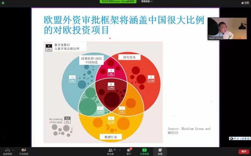 会上,张海晏教授细致地分析了欧盟外商直接投资审查框架内容以及欧盟的需求与利好形势。同时,结合2016年欧盟“中广核”决定与中国对欧盟关键基础设施的投资案例,就中国与欧盟的政治关系、经贸关系以及其他领域合作关系进行展开讨论。张教授表示,中国企业对欧盟的投资,特别是企业收购或兼并情况已呈现出逐年快速增长的趋势;以限制中国竞争力的崛起为目标,加之美国与欧洲监管的同步推进,新的投资保护主义已然兴起;各成员国都有强化外资监管环境的趋势以及媒体对公众舆论的负面影响都成为中国国有企业所面临的挑战。最后,张教授针对中国国有企业在欧洲兼并的成败关键进行总结,欧盟外资审核框架的推出需要中国企业调整对欧投资策略,并制定统一而具有说服力的交易阐述、与政府积极沟通、设立灵活动态的相关利益者管理战略。