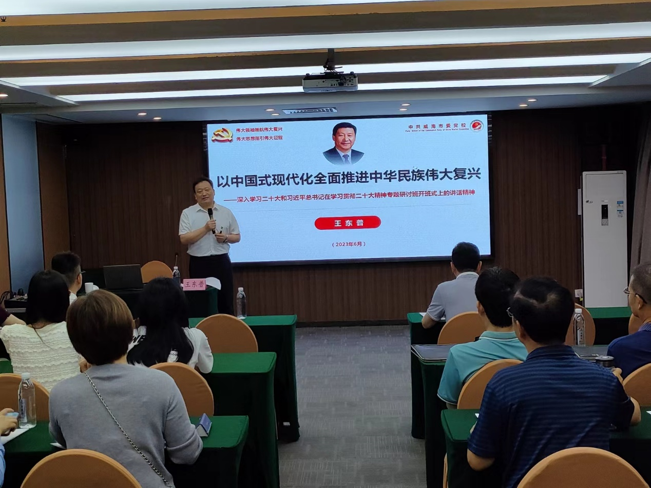 威海市委党校老师为参训学员现场讲授《党的二十大精神解读》。党校老师对党的二十大精神的讲解深入浅出,让全体学员更加准确地把握理解党的二十大主题,深刻领悟“两个确立”的决定性意义,坚决做到“两个维护”。