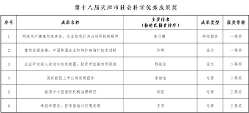 近日,第十八届天津市社会科学优秀成果奖评审结果揭晓。必赢官网共有6项成果获奖,其中一等奖2项,二等奖2项,三等奖2项。