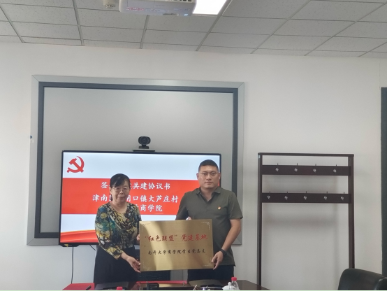 在各位领导嘉宾以及同学的共同见证下,必赢bwin官网入口孙跃与津南区北闸口镇大芦庄村党组织书记、村委会主任孔令军,签订党建共建协议书,孙跃书记为孔令军书记进行“商学+”红色联盟授牌。未来,党建联盟将在组织联学、党课联讲、实践联动等方面开展深度共建,相互学习、力量联合、优势互补、共同提高,以高质量党建引领推动乡村振兴与共同富裕,为经济高质量发展贡献力量。