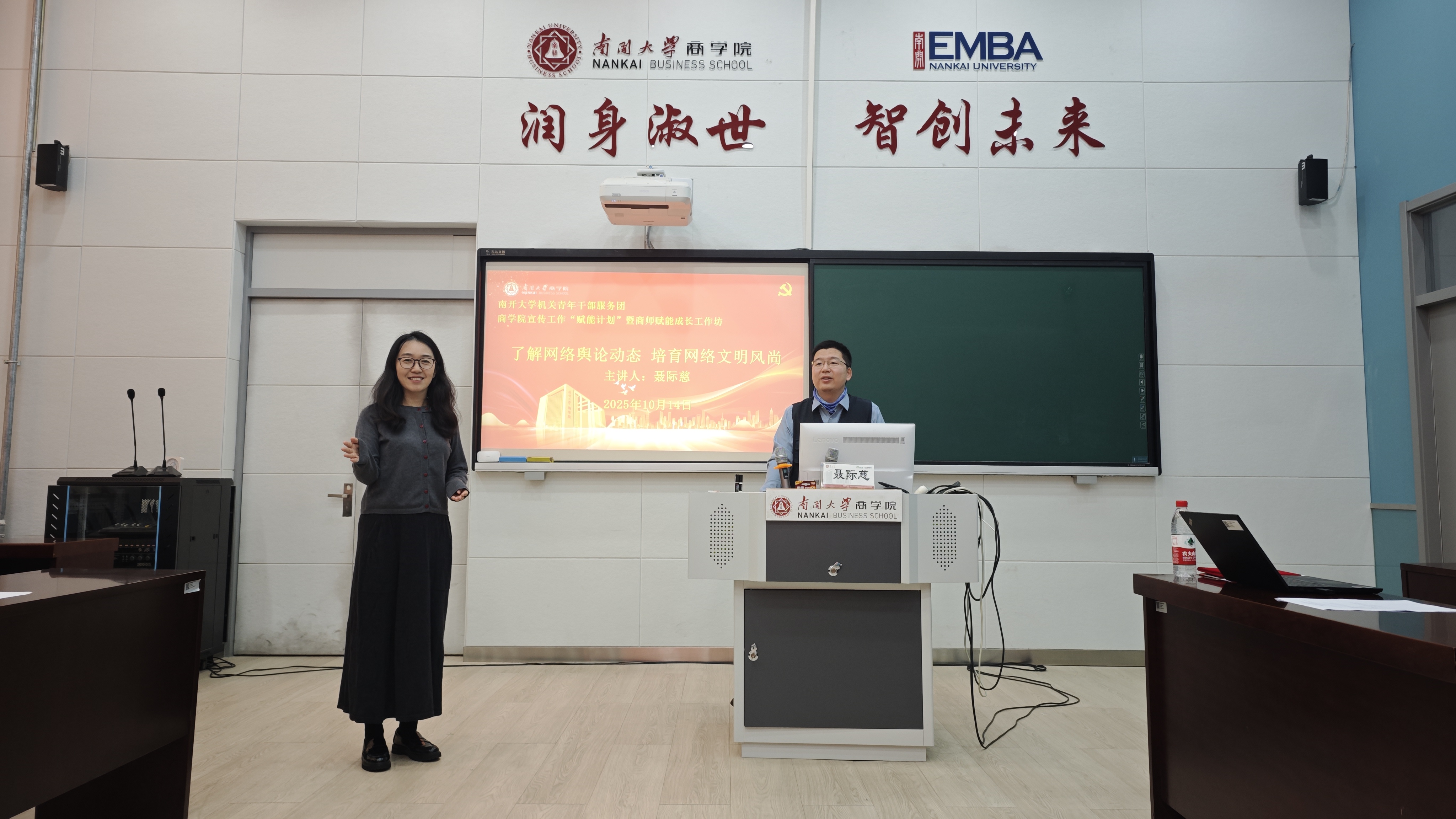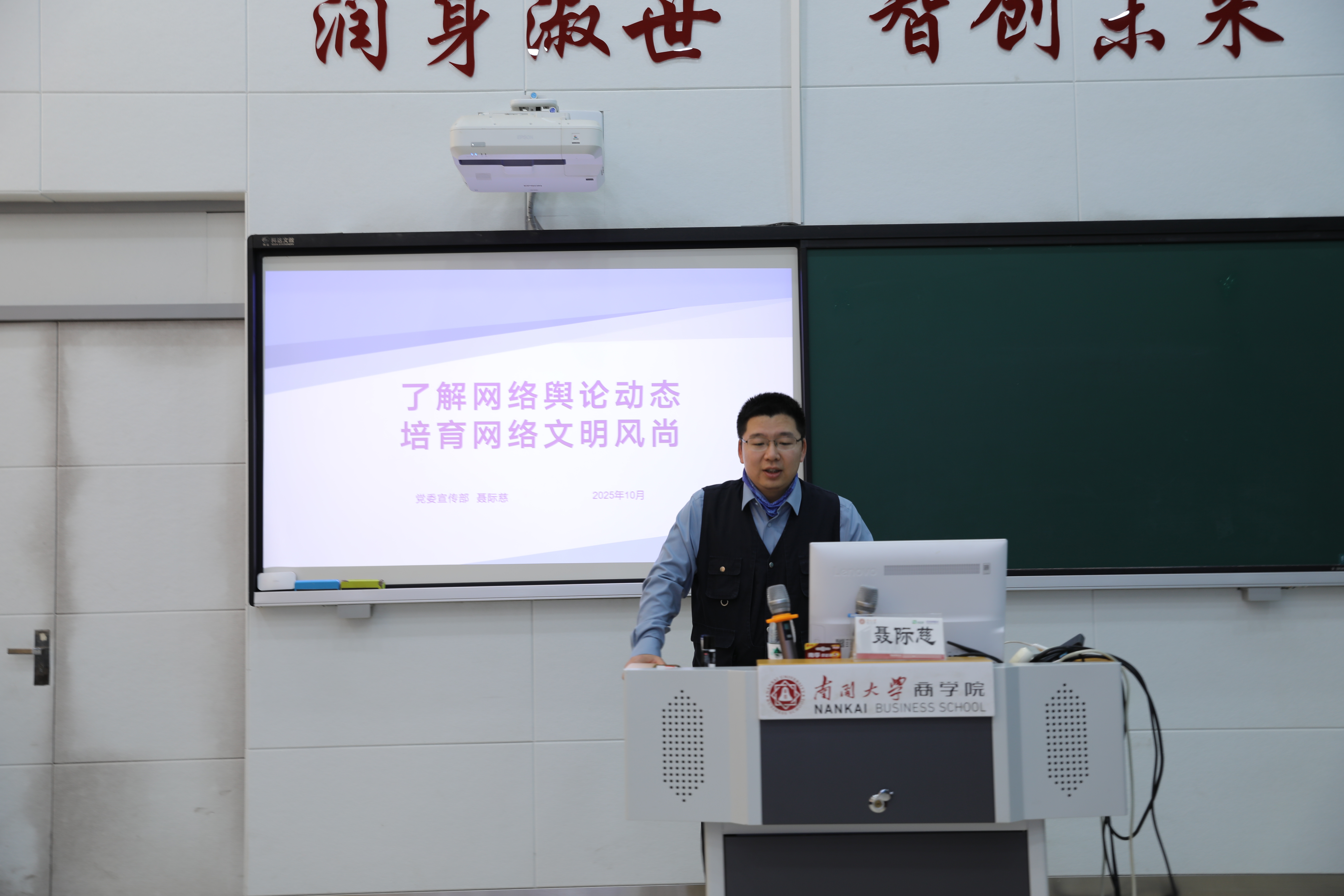 培训中,聂际慈老师系统阐释了宣传思想文化工作的政策要求与实务要点。他详细解读了学校积极构建的思想理论、新闻舆论、文化史论“三论融合”大宣传工作格局与要求,通过丰富的案例分析,重点讲解了师生网络行为的规范要求、常见问题及应对策略。并针对商科学科特点,提供了定制化建议。院党委副书记周翠翠代表学院,为聂际慈老师颁发“青年教工成长导师”聘书。参训人员普遍反映,培训内容以案释法、实用性强,对实际工作的指导意义很强。
