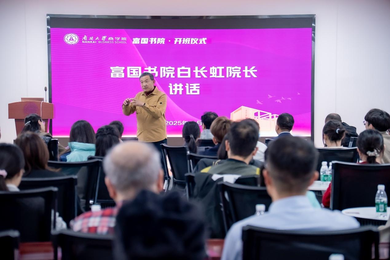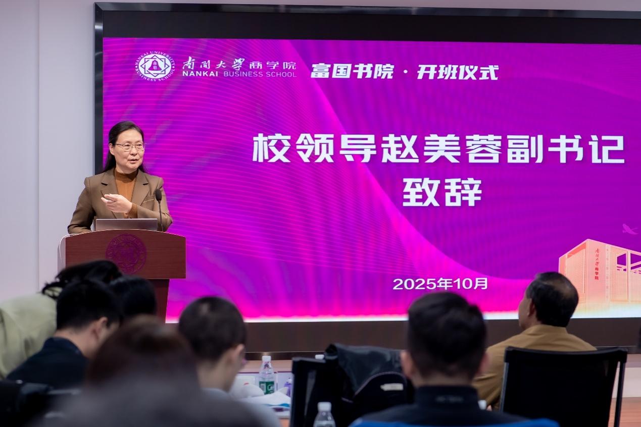 赵美蓉副书记在致辞中指出,富国书院源自张伯苓校长“商以富国”的教育理念,以“允公允能、日新月异”的校训为根基,融合数智时代发展需求,致力于构建“商学+”交叉融合的创新育人平台。她强调要以“创新向未来”的前瞻视角,探索新时代人才培养新范式。赵美蓉副书记寄语新生以周恩来总理“为中华之崛起而读书”为志向,以张伯苓校长“日新月异”的精神自励,勇于跨界探索、敢于实践创新,将“商以富国”的初心使命转化为服务国家发展的真才实学与责任担当。