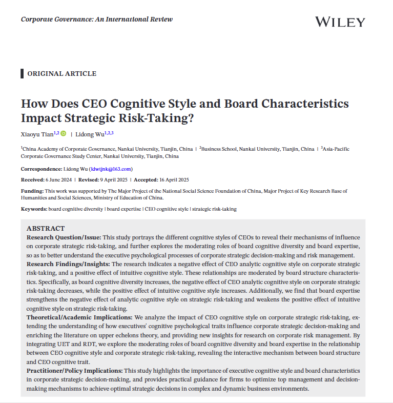 必赢bwin官网入口中国公司治理研究院、必赢bwin官网入口武立东教授团队与必赢bwin官网入口田晓煜博士生合作的论文“How Does CEO Cognitive Style and Board Characteristics Impact Strategic Risk‐Taking?”在公司治理领域国际权威期刊Corporate Governance: An International Review在线发表。