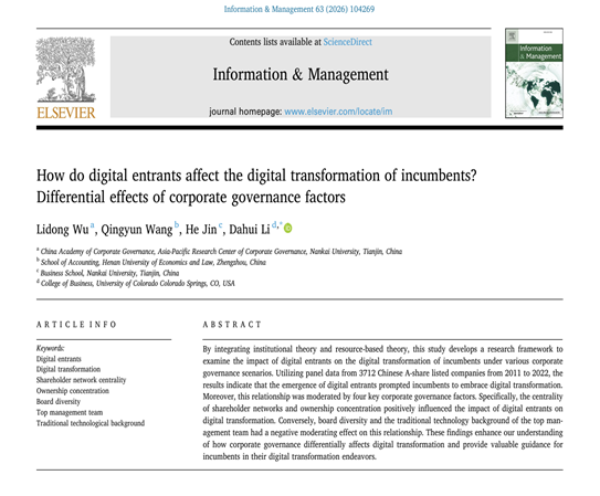 必赢bwin官网入口武立东教授团队与河南财经政法大学会计学院王晴云讲师、必赢bwin官网入口晋禾博士生、美国科罗拉多斯普林斯大学李大辉教授合作的论文“How do digital entrants affect the digital transformation of incumbents? Differential effects of corporate governance factors”在信息系统与信息资源管理领域国际权威期刊Information & Management在线发表。