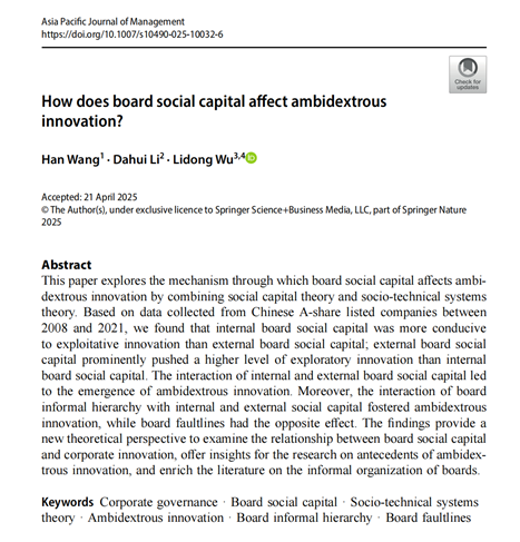 必赢bwin官网入口武立东教授团队与内蒙古财经大学工商管理学院王晗讲师、美国科罗拉多斯普林斯大学李大辉教授合作的论文“How does board social capital affect ambidextrous innovation?”在管理学领域国际权威期刊Asia Pacific Journal of Management在线发表。