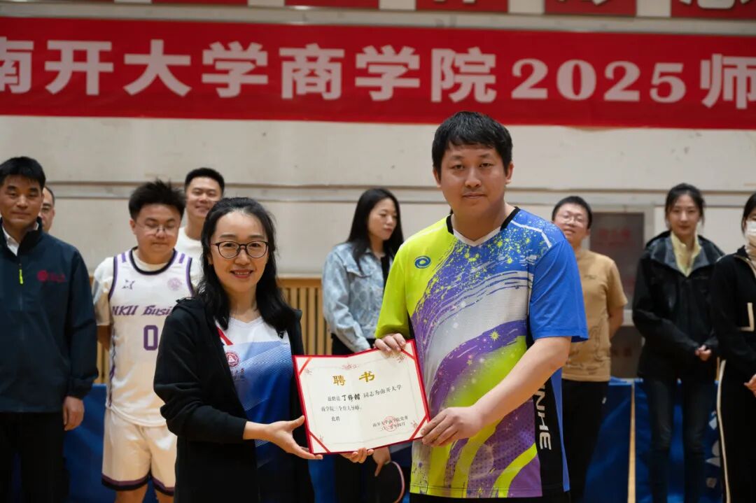为充分发挥体育育人作用,学院党委副书记、副院长周翠翠为体育部教师、国家级健将丁铮锴老师颁发“三全育人导师”聘书,聘请丁老师指导和参与学院体育育人工作。