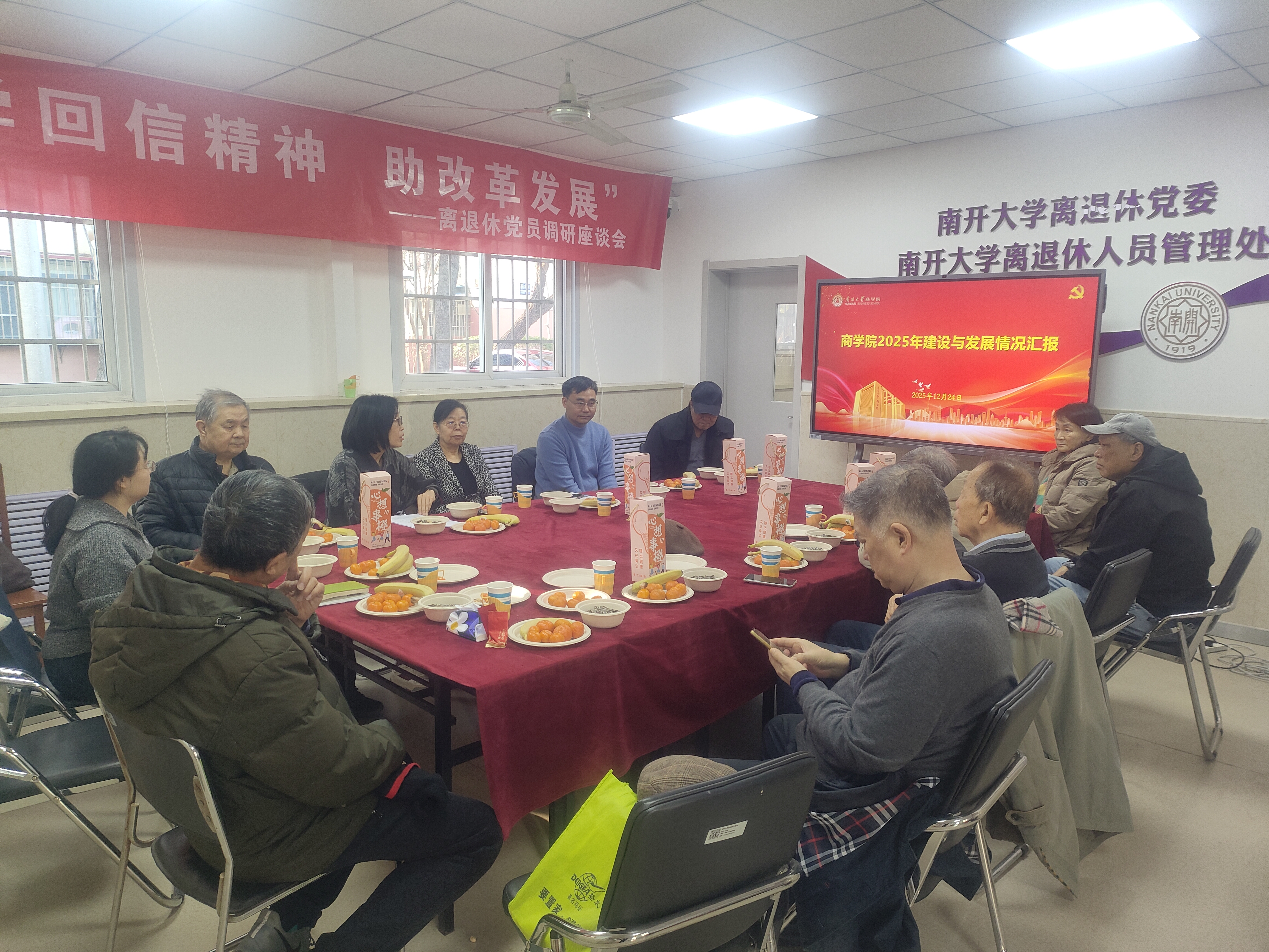 岁末将至,温情渐浓。在“十四五”规划收官、“十五五”规划开局之际,为切实加强对离退休教工党员的关怀与联系,倾听老党员心声改进工作质效,12月24日,在学校离退休人员管理处(以下简称“离退休处”)的指导与支持下,“冬日送暖关切党员心声 情系学院建言规划新程”必赢bwin官网入口离退休党员慰问座谈暨2025年院情通报与意见征求会在离退休处西南村会议室顺利召开。院领导班子成员、行政党支部与离退休党员代表欢聚一堂,共叙深情厚谊、共谈学院发展。