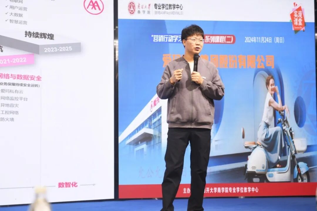 在第二项议程中,卢总为大家分享主题为《AI势能,推向未来》的讲座。卢总首先回顾了爱玛的数智化建设历程,十几年以来,爱玛的数智化历经了从信息化到数字化,再到目前的数智化的三步跨越。作为一家民营制造企业,爱玛的数智化建设以企业战略为牵引,拉动业务精益化,进而实现数字化、智能化技术为营销、制造、价值链、质量管理、供应链、财务等大业务场景赋能。讲座过程中,卢总特别提到:“爱玛将会继续坚持数智化建设,将数智技术发展成为爱玛参与行业内竞争的核心竞争优势,持续以数智技术助力业务,引领企业转型”。