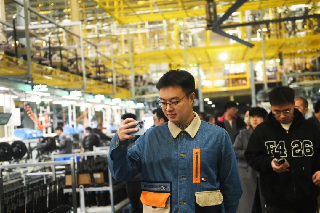 离开产品展示厅后,卢总继续带领大家参观了爱玛的生产车间,车间里十条总装生产线井然有序的运转着,随处可见的准时化生产管理看板实时显示着每条生产线正在流转的物料名称、产线节拍、目标达成率、下线数量等关键生产数据。从零散部件到完整电动车产品出库,整个生产流程高效连贯,师生们无不为爱玛高度智能化与精细化的生产运作管理模式所惊叹。