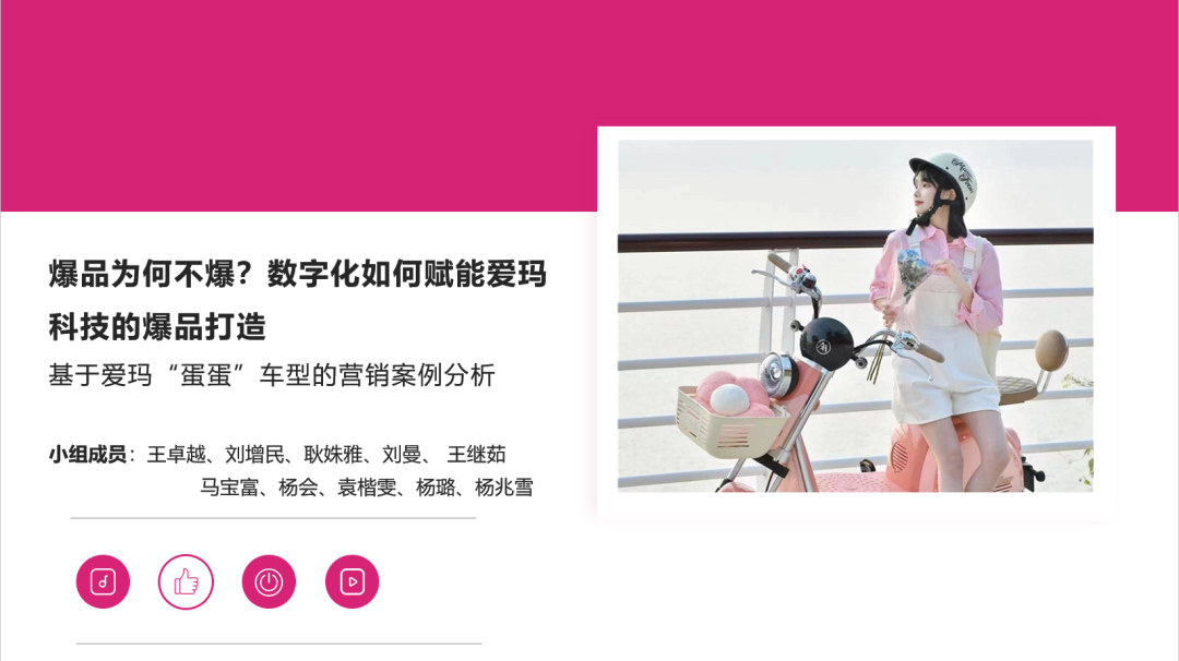 对于“如何打造爆品?”的问题,各组同学们在汇报中聚焦各自关注的重点,基于不同的视角给出了针对性的解决方案。各组同学都不约而同的发现了爱玛爆品打造过程中“用户画像”和“推广渠道”两方面的问题。其中第一组同学以一张充满温情的街边随拍照片为例,提出爱玛要善于敏锐地抓住能够触动用户价值需求的点,这些都是爱玛可以利用数智技术来打造营销平台的重要机会,这是爱玛提炼潜在客户,实现精准营销的重要手段。针对第一组的观点,王学秀老师表示高度赞同,王老师指出爱玛未来可以尝试打造一个开放式创新平台,积极吸纳外部充满创意的创业者,以共创共赢的方式来推动爆品打造战略;此外,有的组从爆品特征入手,结合自身实践经验与理论认知,提炼爱玛“蛋蛋”车型营销过程中的推广手段与营销策略相关问题,最终从渠道推广—经销商疑虑消解—数字技术等维度提出解决方案;也有的组横向对比其他领域或其他行业爆品打造的成功经验案例,通过其他领域爆品打造的多案例对比性分析,凝练出爆品的目标用户群体所具有的特征。进而以用户特征为导向,以数字化、智能化技术为支撑打造系统化营销推广策略。