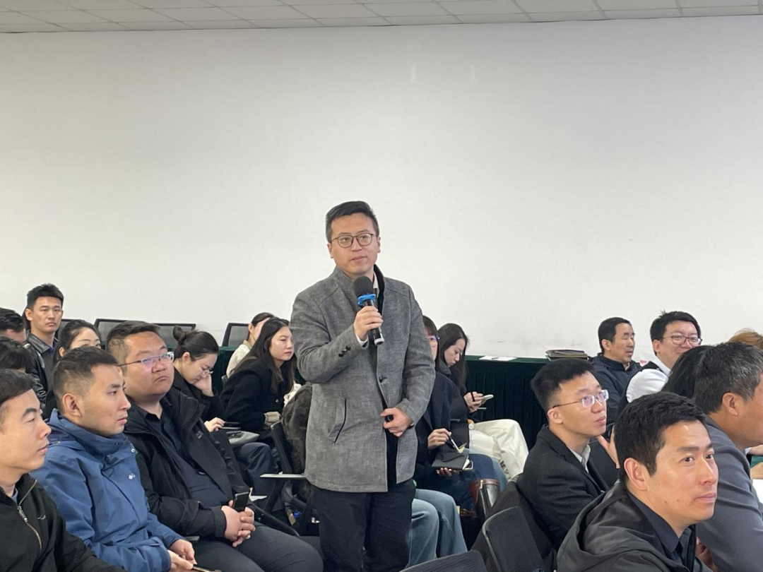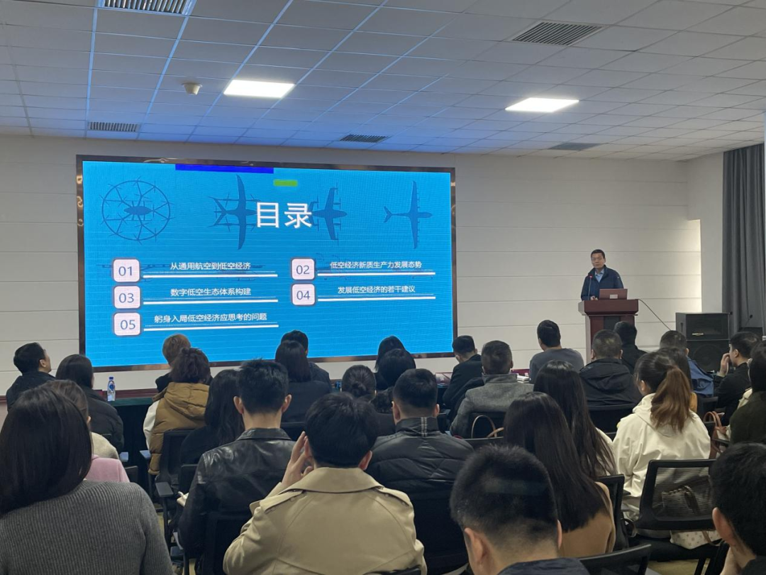 参观结束后,师生们进入会议室,天津低空经济发展有限公司副总经理刘建涛先生对大家的到来表示欢迎。随后,刘总在产业园报告厅为师生们详细介绍了低空经济发展中的应用场景、政策支持、技术突破、面临的问题及未来方向等内容,分享了他心目中的“低空经济产业图景”。
